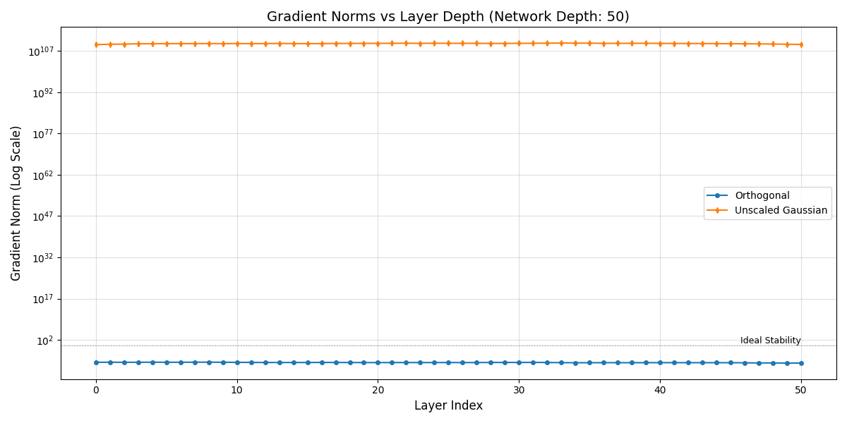 Clearly, for Gaussian-initialized weights, the norms of gradients explode, while for orthogonally-initialized weights, the gradient norms stay within a good range.