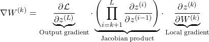 - The last term is the local gradient, i.e., how the output of layer ( l ) depends on its own weights.